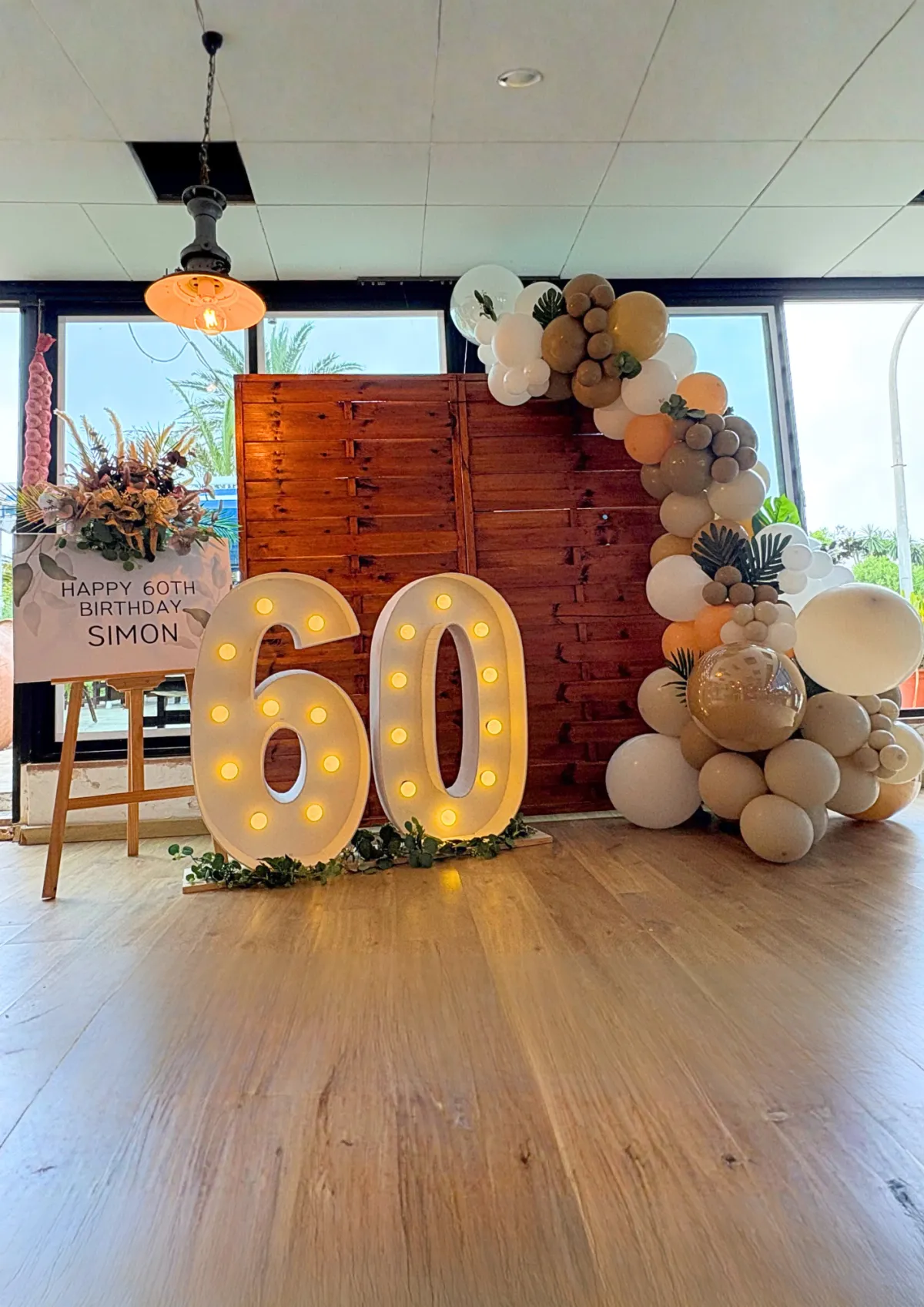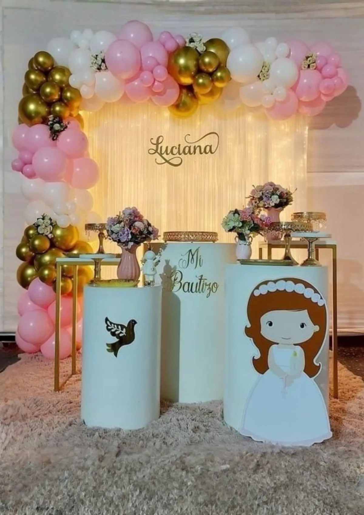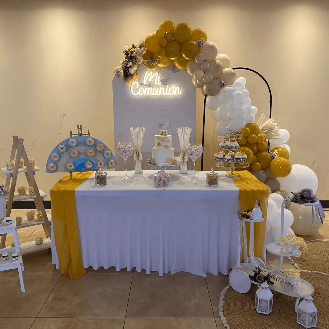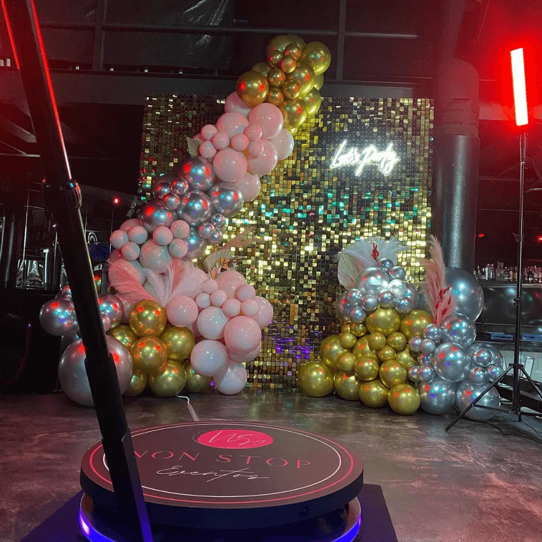 Decoración premium con globos, estructuras, fondos, cilindros, mesas y detalles decorativos diseñados a medida para cada cliente.