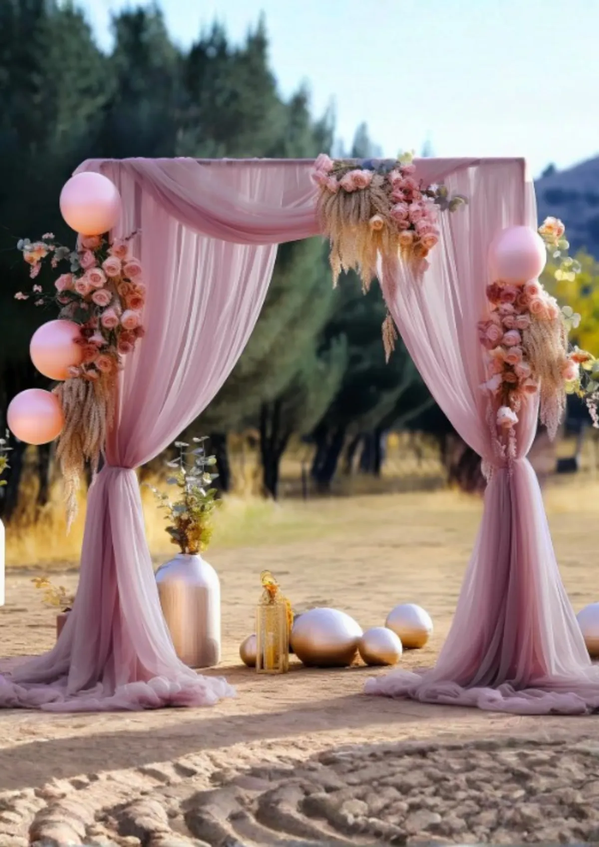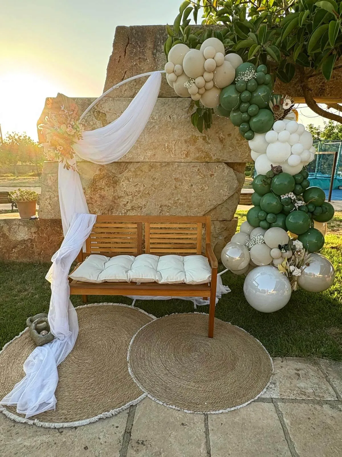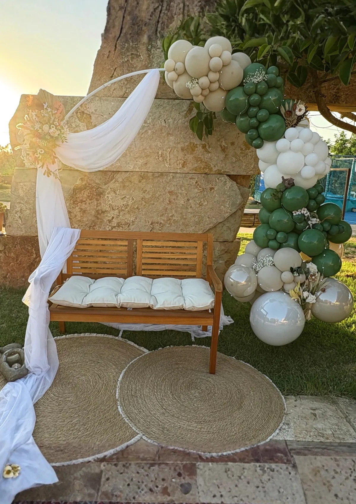 Decoración premium con globos, estructuras, fondos, cilindros, mesas y detalles decorativos diseñados a medida para cada cliente.